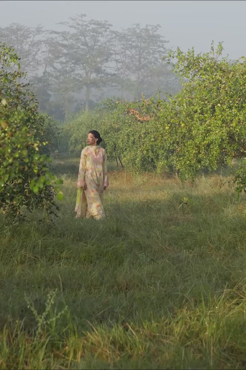 Echoing the warmth of a gentle summer bloom, a soft peach jacquard lawn shirt is adorned with an English garden inspired floral print in apricot, butter yellow, and fresh green tones. Delicate embroidery and eyelet detailing trace the neckline and extend along the sleeves, while fine linear threadwork adds subtle texture through the length of the shirt. Matching printed jacquard lawn culottes complete the look. The ensemble is paired with a sheer chiffon dupatta in soft chartreuse gradients, adding a cheerful finish.
