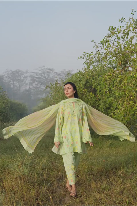 Evoking the freshness of a sunlit garden, an apple green jacquard lawn shirt is adorned with an English garden inspired floral print in apricot, butter yellow, and fresh green tones. Delicate embroidery and eyelet detailing trace the neckline and extend along the sleeves, while fine linear thread work lends subtle texture through the length of the shirt. A coordinating printed jacquard lawn shalwar completes the look. The ensemble is paired with a sheer chiffon dupatta in apple green and soft citrus gradients, adding a cheerful finish.