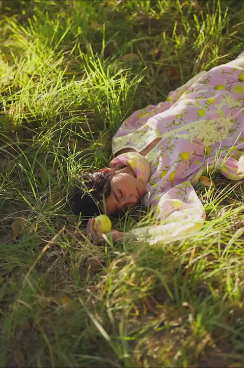 Welcoming the spring season, a blush jacquard lawn shirt carries a scattered citrus and foliage print in soft lemon and muted olive tones. Contrasting aari embroidery defines the neckline and sleeve hems, lending subtle definition. The look is paired with ivory jacquard lawn culottes, finished with embroidered lemon motifs and slit detailing along the hem. A sheer printed chiffon dupatta echoes the citrus theme in blush and lemon yellow tones, completing the ensemble.