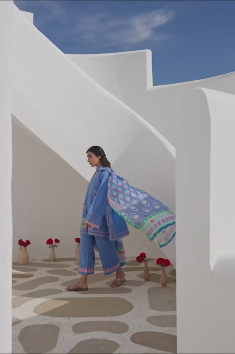 Radiating the vibrancy of a sunlit seascape, a cerulean jacquard lawn shirt is adorned with soft ivory and blush floral bouquet embroidery along the hemline. Tropical foliage embroidery traces the neckline and extends gently along the sides, framing the silhouette. Postcard inspired appliqué details accent the hem with a playful narrative touch. Matching jacquard lawn culottes complete the look, finished with powder blue leaf appliqué at the hem. A statement medium silk dupatta in layered cerulean, fern, and blush tones carries geometric and botanical motifs, lending a rich finish.