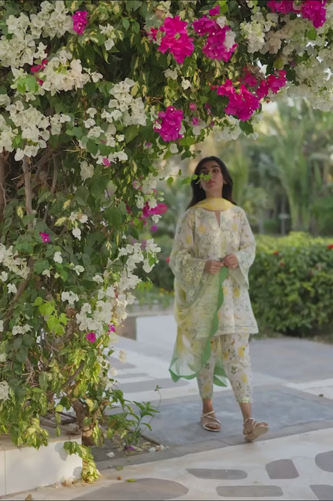 Fresh and delicate in mood, a cream toned jacquard lawn shirt features a finely arranged floral print in butter yellow and soft sage tones, creating a light, garden inspired palette. Floral embroidery defines the neckline, complemented by eyelet and scalloped detailing along the sleeves. The ensemble is paired with a printed jacquard lawn shalwar in matching tones, finished with scalloped floral embroidery at the hem. A matching chiffon dupatta in lemon yellow and cream hues carries a coordinating floral composition, framed with a contrasting border.