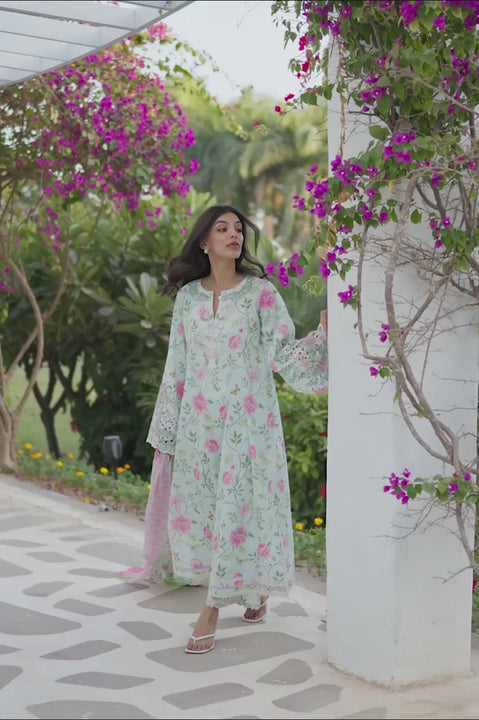 Fresh and delicate in mood, a subdued aqua jacquard lawn shirt features a finely arranged floral print in pink and soft sage tones. Floral embroidery highlights the neckline, complemented by eyelet and scalloped detailing along the sleeves. The ensemble is paired with printed jacquard lawn culottes in matching tones, finished with scalloped floral embroidery at the hem. A matching chiffon dupatta completes the look with a coordinated floral composition, framed with a contrasting border.