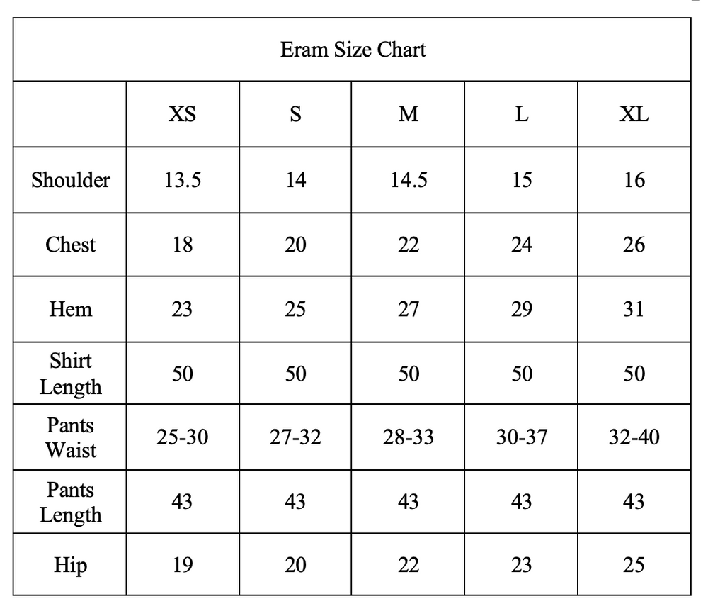 The size chart is the last image on this page and shows the one sided measurement in inches, of the stitched outfit.