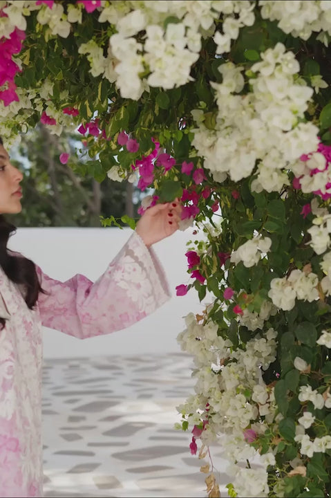 Vivid and expressive, a flamingo pink jacquard lawn shirt carries a delicate tonal chinoiserie motif, layered with intricate white aari embroidery forming a defined central panel and extending across the sleeves. Subtle eyelet bouquet accents introduce gentle texture. A matching jacquard lawn shalwar completes the look, finished with a restrained tonal pattern. The ensemble is paired with a printed chiffon dupatta in layered flamingo and fuchsia tones, showcasing a geometric composition framed with an ikat border.