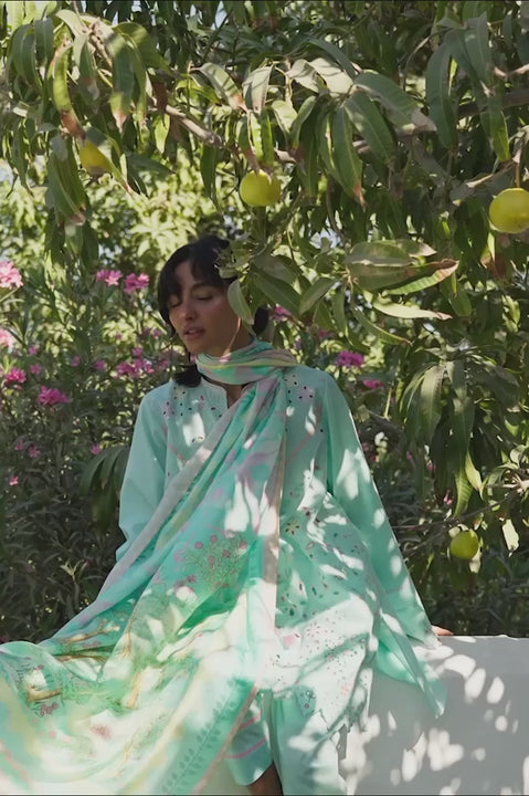 Light and serene in mood, an aqua jacquard lawn shirt is adorned with botanical embroidery in a soft pastel palette, accented by eyelet detailing along the neckline and front. A scalloped embroidered hem lends a refined finish. The ensemble is paired with a matching jacquard lawn shalwar, finished with fine embroidery along the hem. A printed medium silk dupatta completes the look, showcasing a scenic floral composition in shades of pistachio, celadon, and soft blush, finished with whimsical English garden motifs at either end.